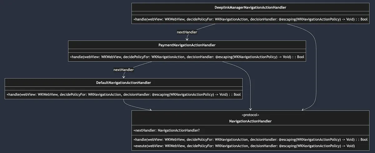 MyWKWebViewController’sfunc webView(_ webView: WKWebView, decidePolicyFor navigationAction: WKNavigationAction, decisionHandler: @escaping (WKNavigationActionPolicy) -> Void)-> callsheadNavigationHandler?.exeute(webView: webView, decidePolicyFor: navigationAction, decisionHandler: decisionHandler)to execute the chain processingStrategy Pattern