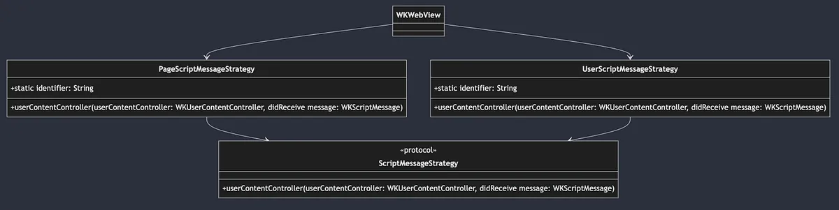 The system already defines the Protocol and the corresponding func add(_ scriptMessageHandler: any WKScriptMessageHandler, name: String) method. We only need to implement our own WKScriptMessageHandler and add it to the WKWebView. The system will then dispatch to the appropriate concrete strategy based on the received name, following the Strategy Pattern.