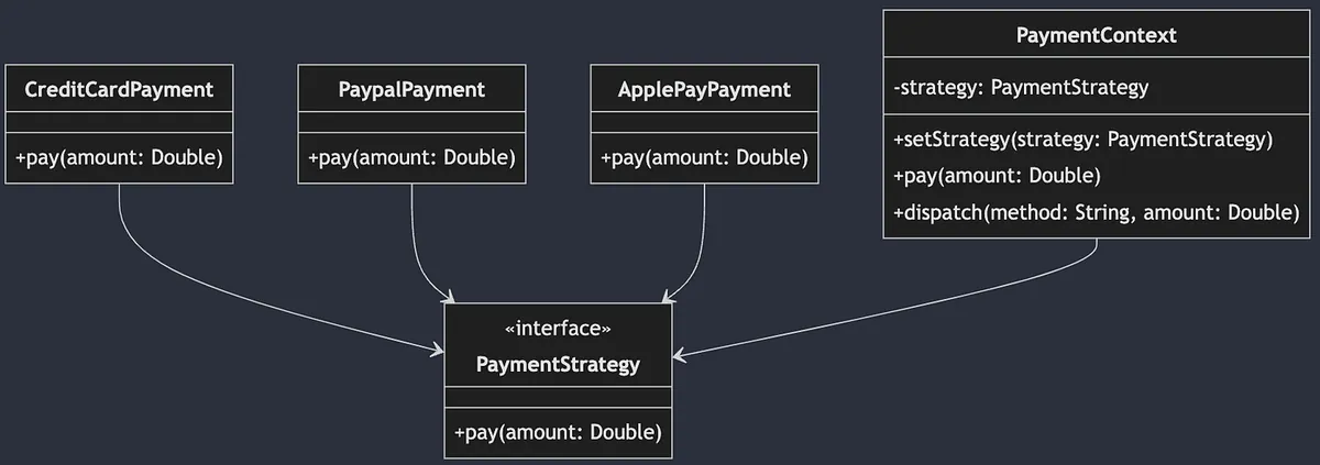The above diagram uses different payment methods as examples. We abstract payment as a Payment Protocol (Interface), then each payment method implements its own version. In PaymentContext (simulating external use), the corresponding Payment instance is created based on the user’s chosen payment method, and pay() is called uniformly to process the payment.