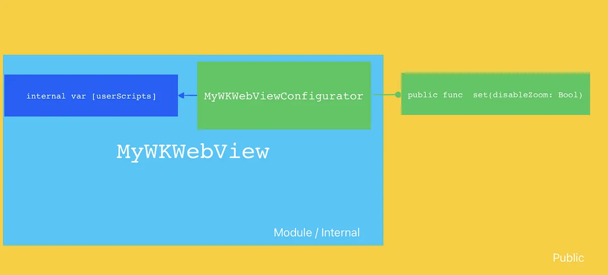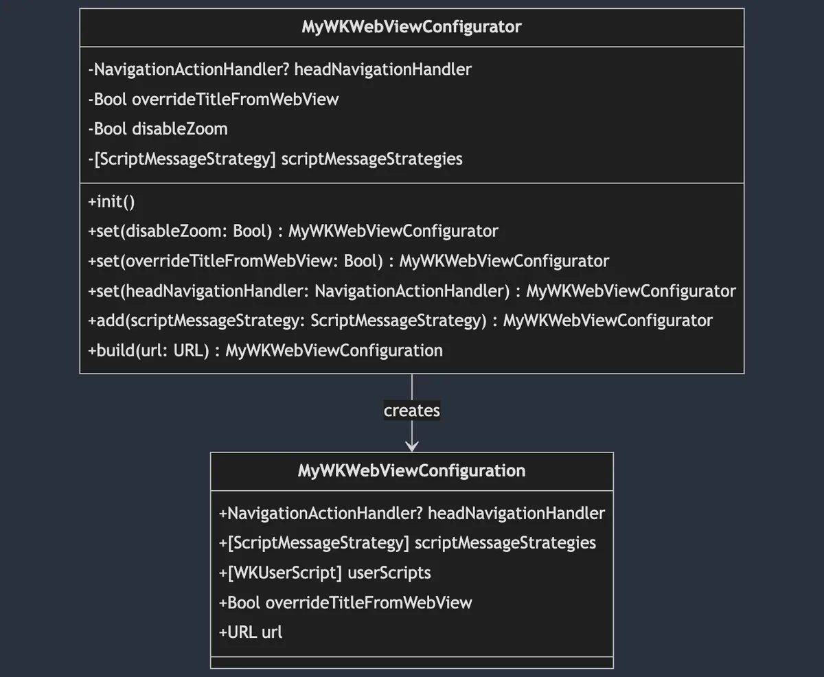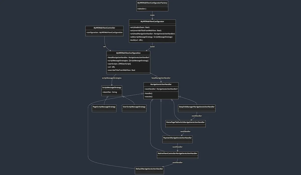 MyWKWebViewConfigurator-> EncapsulatesMyWKWebViewConfigurationparameters and build stepsMyWKWebViewConfigurationInjection -> Used byMyWKWebViewControllerChain of Responsibility Pattern