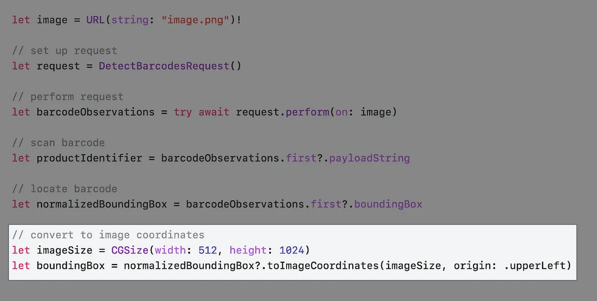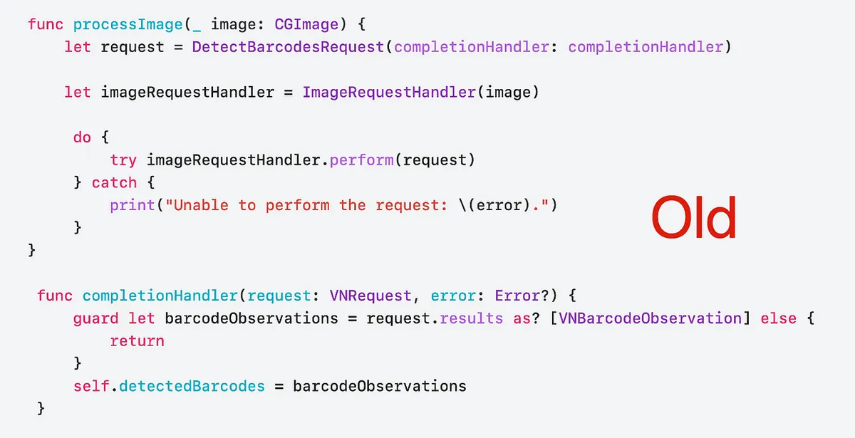 let barcodesRequest = VNDetectBarcodesRequest(completionHandler: barcodesCompletionHandler)