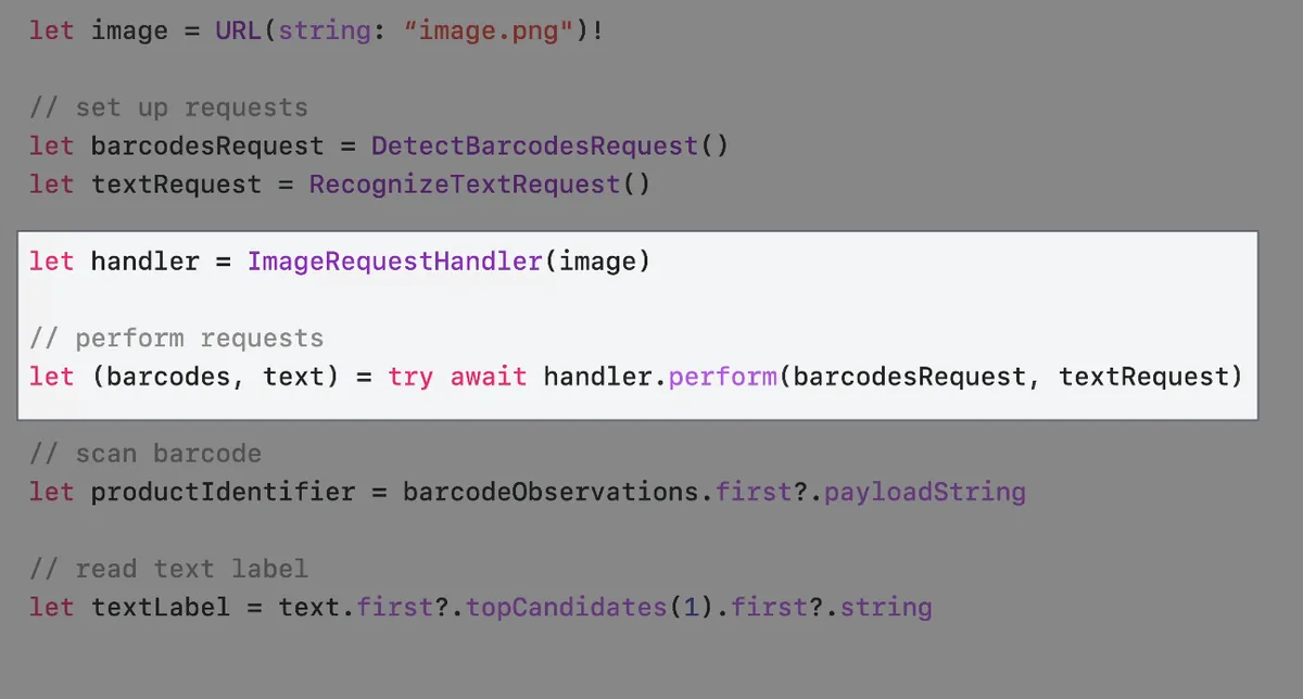 // let (barcodesObservation, textObservation, ...) = try await handler.perform(barcodesRequest, textRequest, ...)
