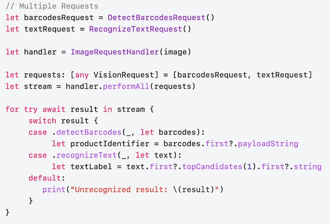 前面的 perform(barcodesRequest, textRequest) 處理 Barcode 掃描跟文字掃描的方式需要等到兩個 Request 都完成才能繼續執行;iOS 18 開始提供新的 performAll() 方法,將回應方式改為串流,在收到其中一個 Reqeust 結果是就能做對應處理,例如掃描到 Barcode 就直接響應。