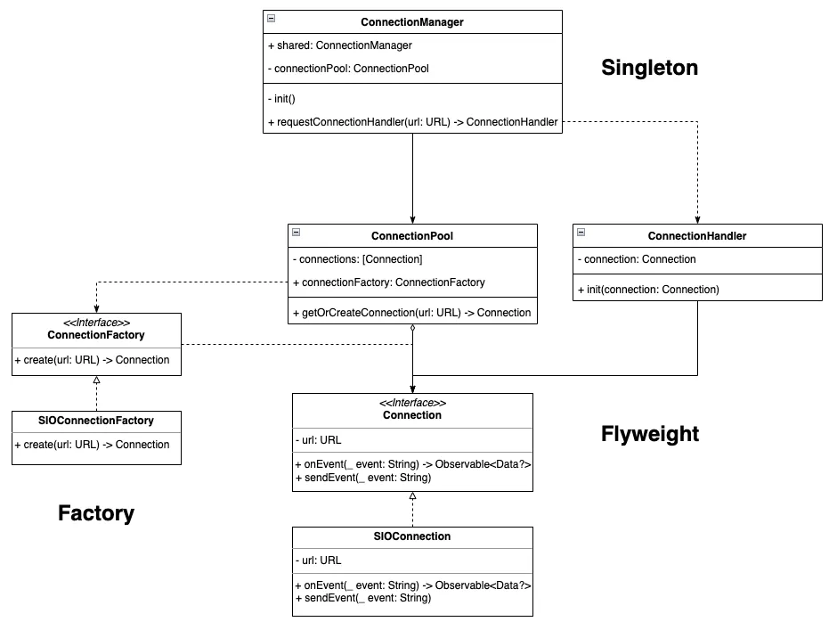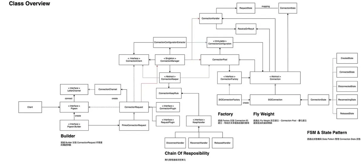 ConnectionPool顧名思義就是 Connection 的共用池子,統一從這個池子的方法拿出 Connection,其中邏輯就會包含當發現 URL Path 一樣時直接給予已經在池子裡的 Connection。ConnectionHandler則做為Connection的外在操作、狀態管理器。 - Factory Pattern: