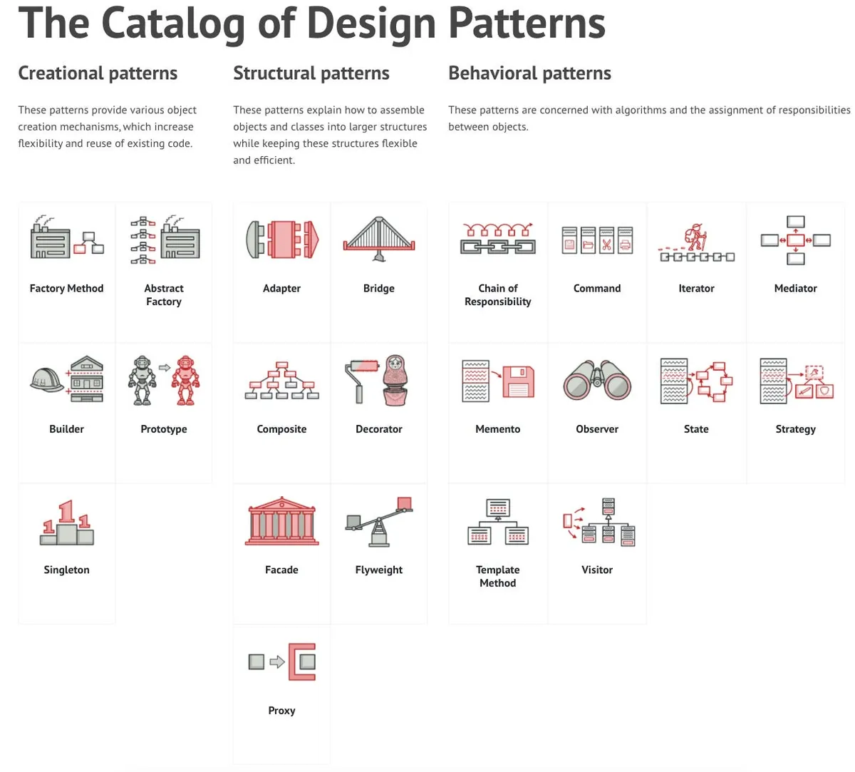 因篇幅有限,本文不會詳細介紹每個設計模式的架構,請先點各個模式的連結進入了解該模式的架構後再繼續閱讀。