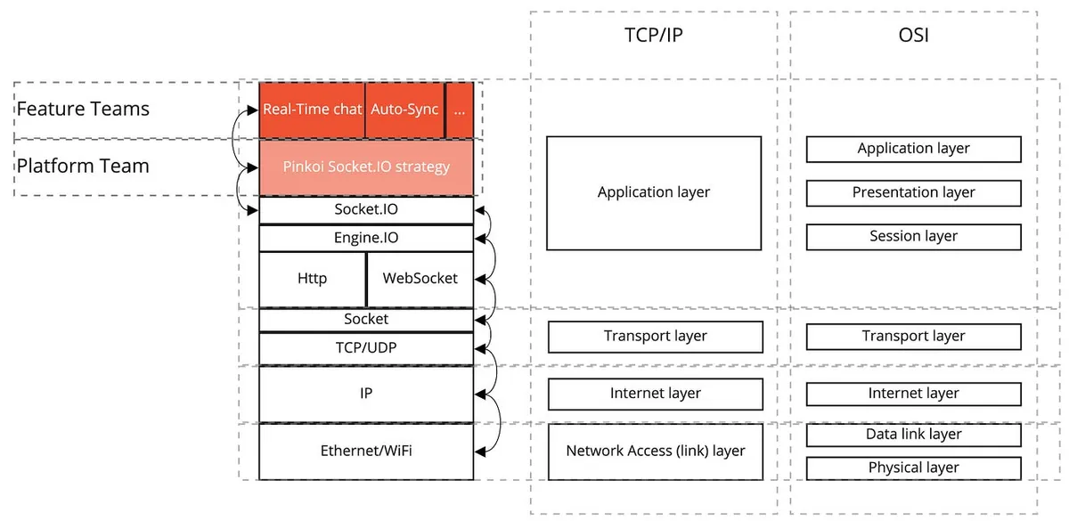 Platform Team 這層的主要職責是橋接 Socket.IO 與 Pinkoi Server Side 之間的邏輯,供應上層 Feature Teams 開發功能時使用。
