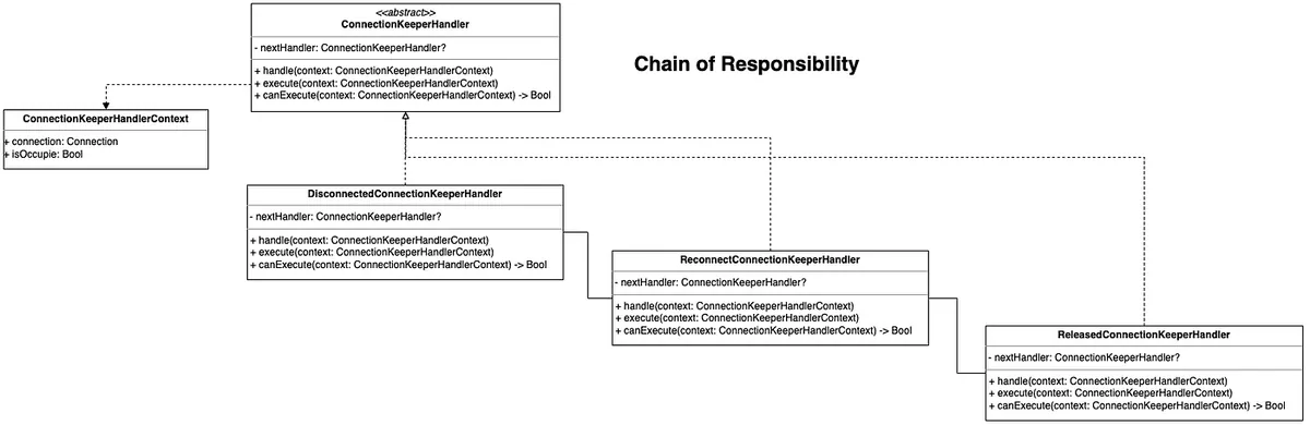 ConnectionKeeperHandler為鍊的節點抽象,特別抽出canExcute方法避免發生上述 這個節點接下來處理了,但做完又想呼叫後面的節點繼續執行的狀況、handle為鍊的節點串連、excute為要處理的話會怎麼處理的邏輯。ConnectionKeeperHandlerContext用來存放會用到的資料,isOccupie代表 Connection 有無人在使用。