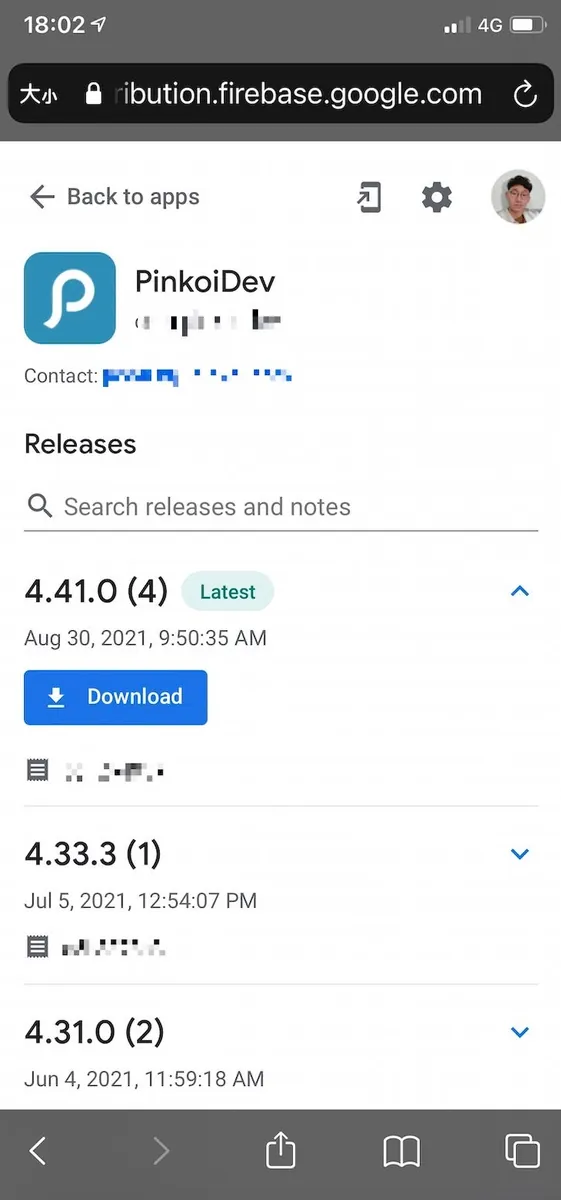 要测试的队友,只要照著 Firebase App Distribution 的步骤安装完凭证、注册完装置,就能在上面选择安装想要的测试版,或直接回去点信的连结安装。