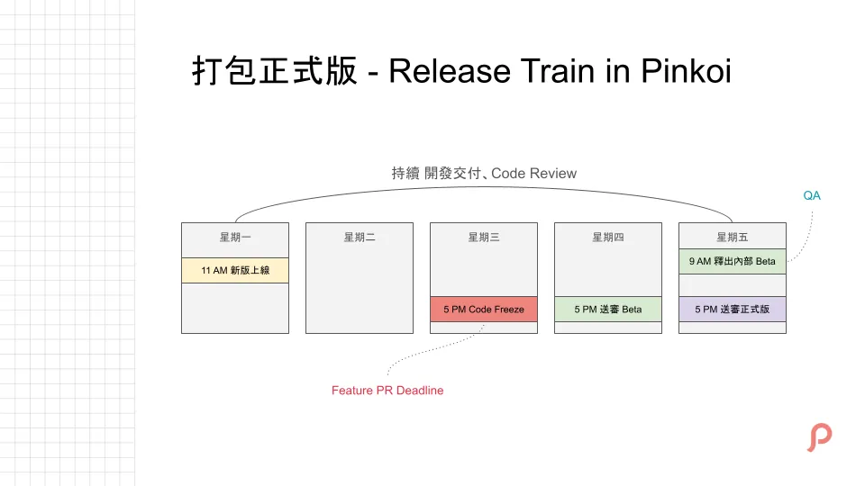 - 原则上这个共识是所有团队都要遵守,所以不希望有需求是打破这个规则的 (EX: 特别周三要上),但如果是与外部合作的项目,如果真的没办法还是要保持弹性,毕竟这个共识是团队内的。