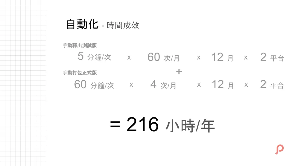 Recap 自动化打包正式版的成效,一样直接使用现有工具串接;除了 自动化之外还加入固定流程达到加倍提升工作效率
