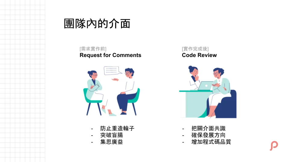 除了可以防止重造轮子之外,还可以集思广益,例如之后其他人要扩充别人要怎么用、或日后可能有什么需求可以列入考量…等等,当局者迷旁观者清啊。