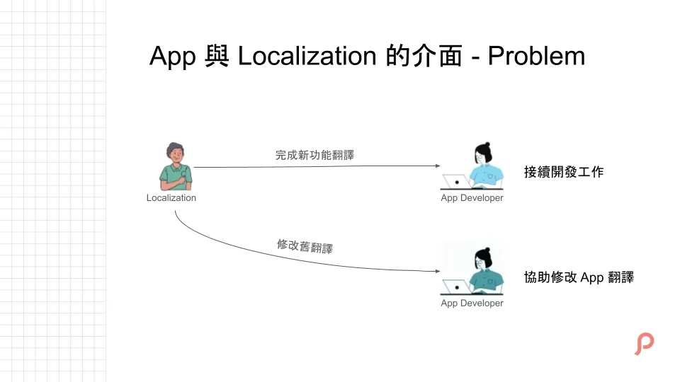 所有翻译、Key 都由第三方工具管理,我们只要事先定好 Key 就能分头行动,双方只要在 Deadline 打包前完成工作即可,不用互相依赖;Localization Team 完成翻译后,工具会自动触发 git pull 更新最新的文字档到专案内。