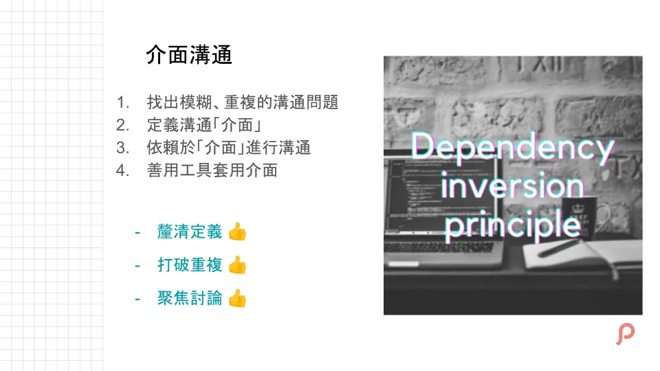 这边引入的想法是透过一个共识的介面来做沟通,就类似我们工程物件导向程式设计中, SOLID 原则里的 依赖反转原则 Dependency inversion principle (不懂也没关系);在沟通上也能应用相同的概念。
