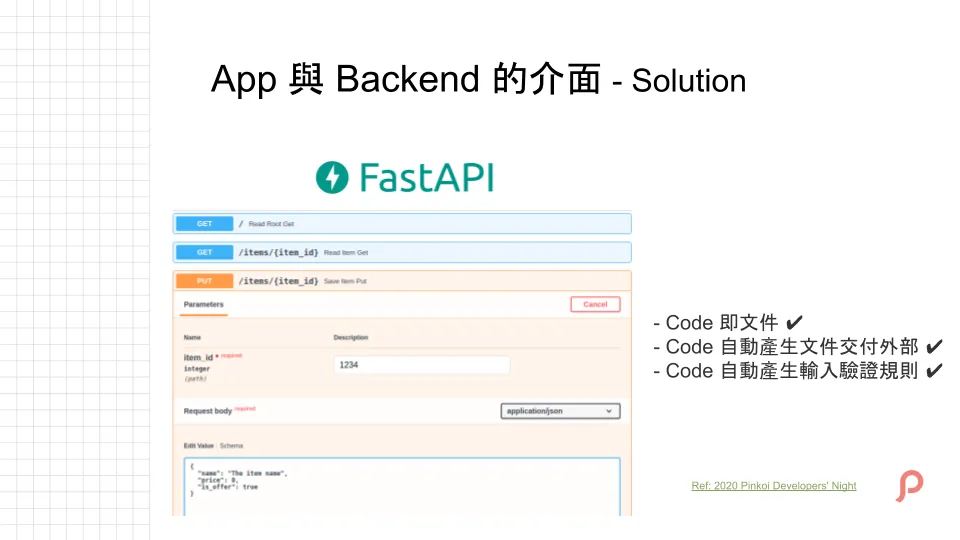 Pinkoi 使用的是 Python (FastAPI) 从 API Code 自动产生文件,PHP 可以用 Swagger (之前公司做法);优点是文件的大框架、资料格式都能从 Code 自动产生出来,降低维护成本,只需处理好栏位说明即可。