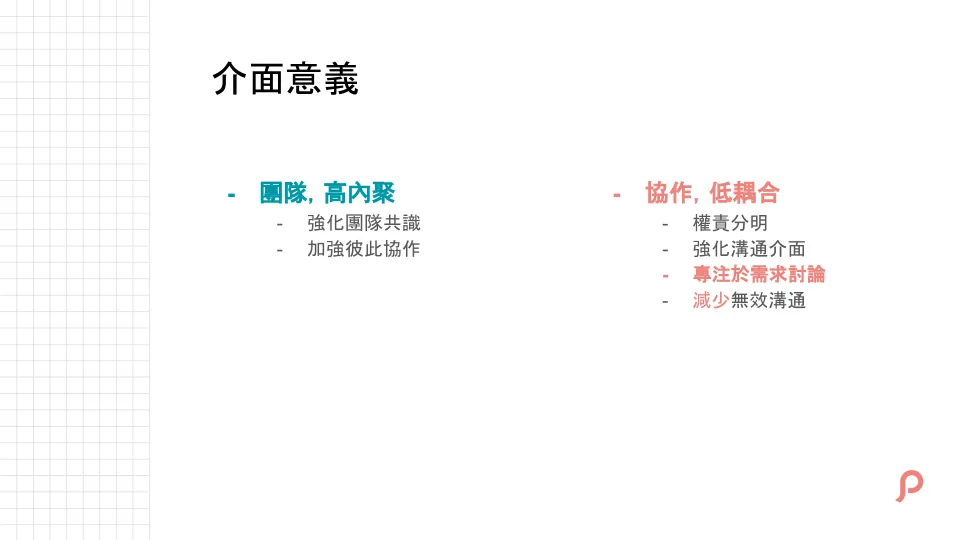 Recap 介面意义,团队内的介面是用来增加彼此的共识,团队外的协作是降低彼此的无效沟通,用介面作为沟通没截,专注于需求讨论。