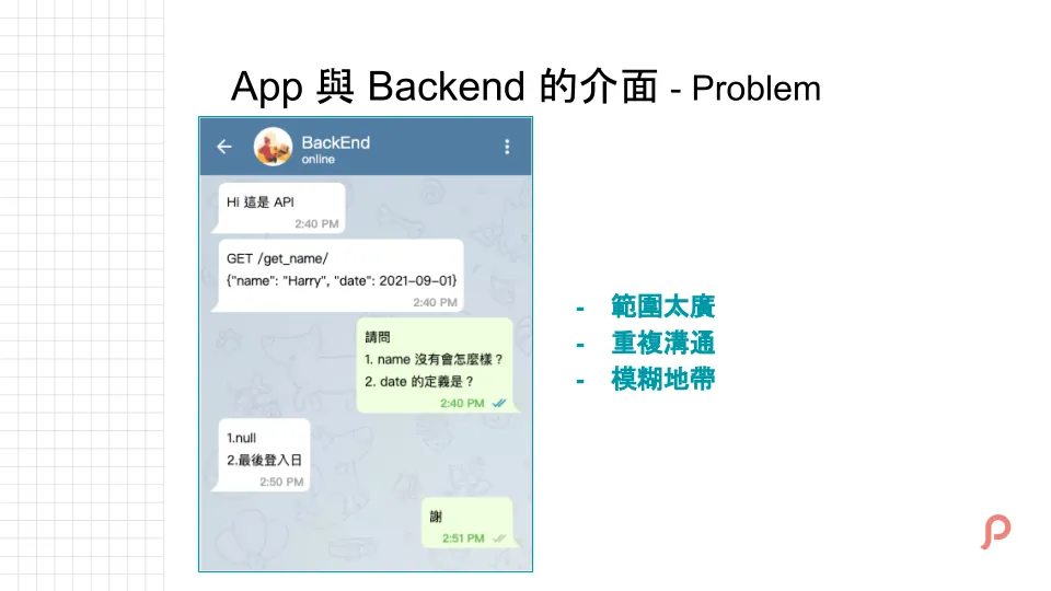 App 与 Backend 彼此缺少的就是一个沟通介面,Solution 有很多种,也不一定要用工具;可以只是一份人工维护的文件。