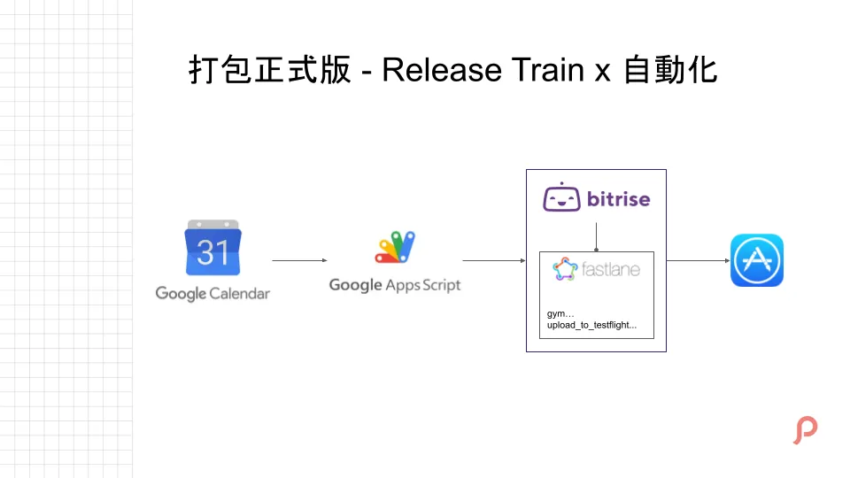 既然我们已经固定日程了,这边直接引入 Google Calendar,将预计日程要做的事加到行事历上,时间到的时候会透过 Google Apps Script 去呼叫 Bitrise 执行 Fastlane 打包正式版和送审的脚本完成全部工作。