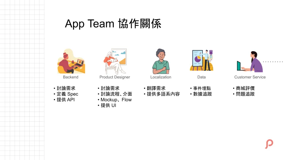 人数规模成长,以 App Team 为例,会有比较密切协作的有这些职务。