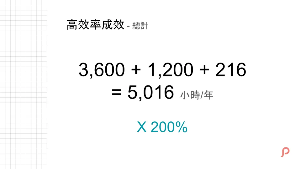 心流切换成本 (3,600) + 沟通介面不好的情况下多余的沟通 (1,200) + 自动化解决的重复性工作 (216) = 一年多损失了 5,016 小时。