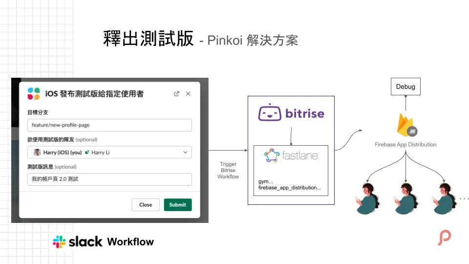 在 Pinkoi 的解法是,首先将「由 App Team 来安装测试版」这件事拆开,用 Slack WorkFlow 做为 Input UI 来达成,输入完成后会触发 Bitrise 跑 Fastlane 脚本去打包上传测试版 ipa 到 Firebase App Distribution。