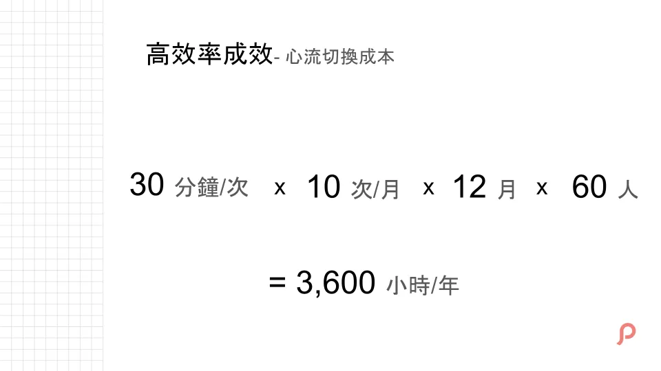 被无谓的事打断的心流切换成本也应该列入计算,这边抓 30 分钟每次,一个月发生 10 次,60 人一年就多浪费 3,600 小时。