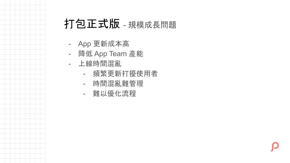 但团队大,同时有多线的需求在开发跟迭代,就会遇到如上图的状况,没有做好前文说的「介面沟通」就会大家各自上各自的,这会导致 App Team 疲于奔命,因 App 更新的成本比网页高、过程繁琐,另一方面频繁零乱的更新也很干扰使用者。