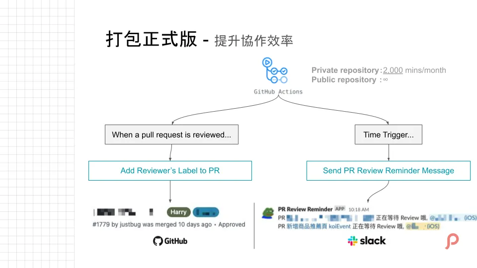 (右)是每天会在固定时间整理&发送讯息到 Slack Channel,提醒队友有哪些 PR 正在等待 Review( 仿造 Pull Reminders 的功能 )。