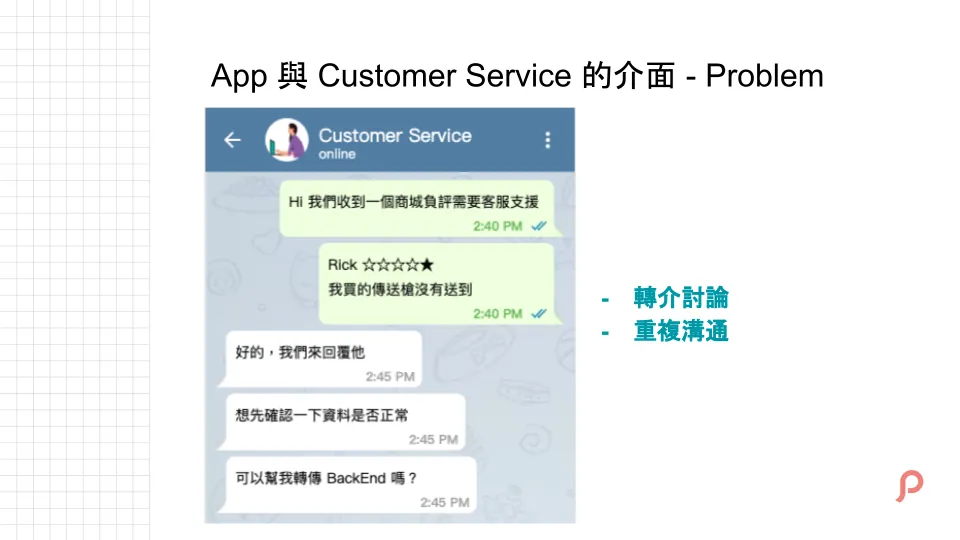 第三个是和 Customer Service 的介面,商城的评价对产品很重要但他却是一个非常人工跟重复转介沟通的事。
