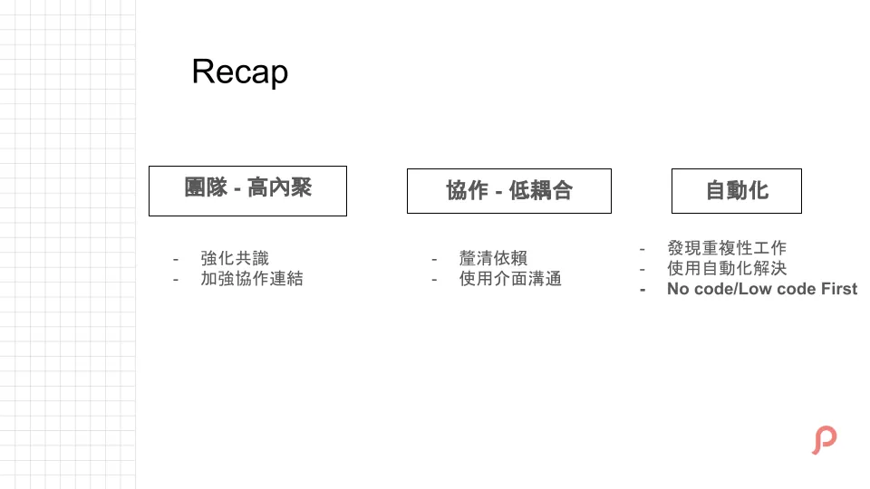 No Code/Low Code First 优先选择现有工具串接(如本篇范例)如果没有现有工具可用再来评估投入自动化的成本,跟实际节省的收入。