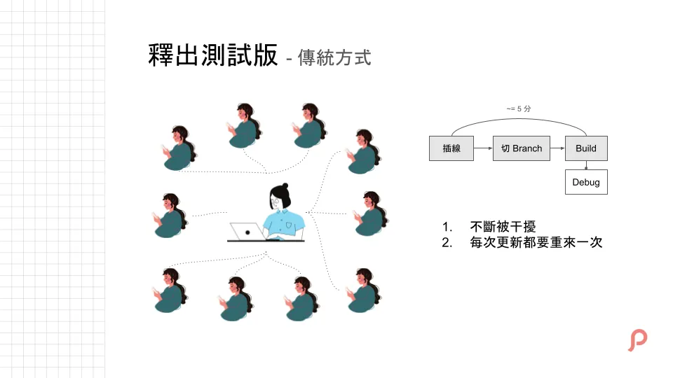 第一个要说的重复性问题,是当我们 App 在开发阶段想要给其他队友抢先测试的时候,传统就是直接借手机来 Build;如果只有 1~2 人问题不大,但是团队有 20~30 人要测,光帮忙安装测试版那天就不用工作了,而且若有更新,整个就都要重新来过。