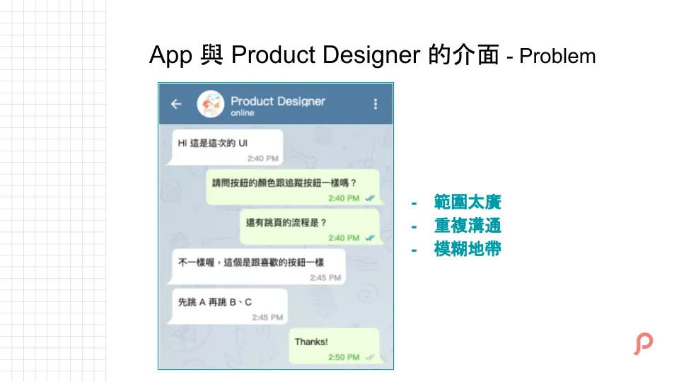 第二个是与 Product Designer 的协作,其实道理上与 Backend 类似,只是问题换成是确认 UI Spec、确认 Flow。
