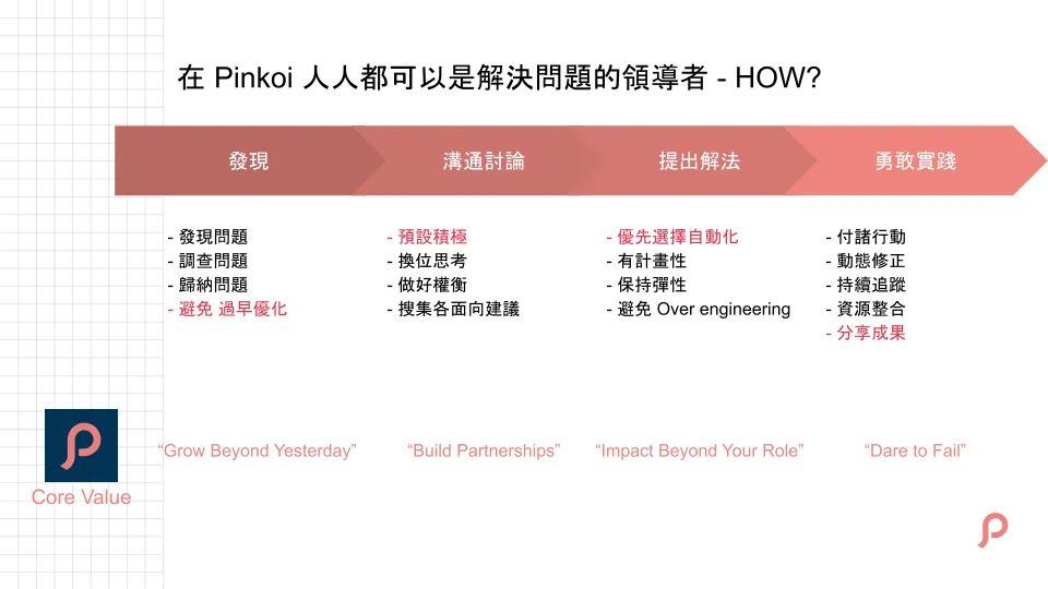 关于团队文化是如何支持推动改变的,解决问题的四个阶段都可以连结到 Pinkoi 的 Core Values。
