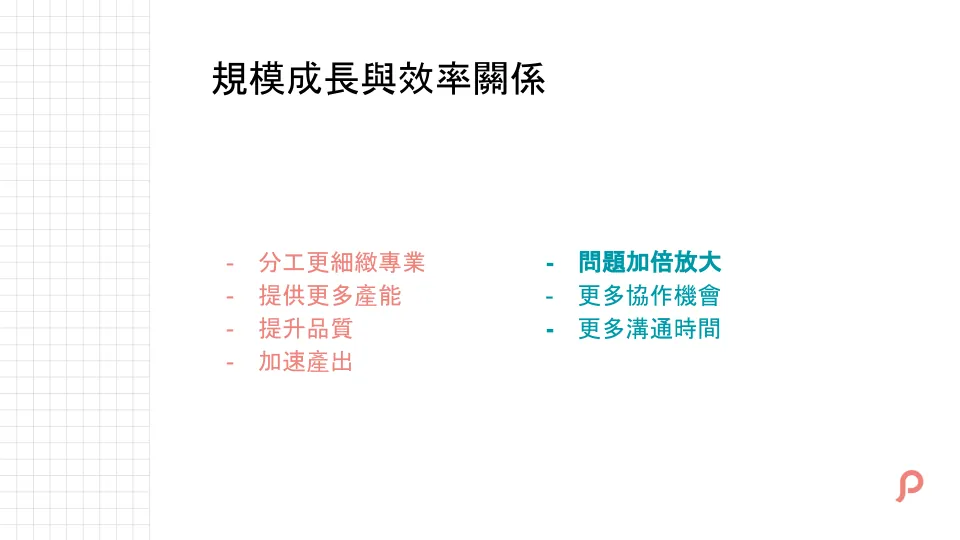 人数规模成长跟工作效率的关系,待过 10 个人的新创到百人的团队(还没挑战过千人)但是光从 10 跳到 100,10 倍的差距在很多事上就很有感了。