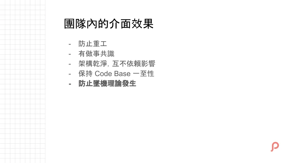 统整一下团队内介面共识的功能,最后提到一个 坠机理论 的 Mindset 我觉得是个不错的行为基准点。