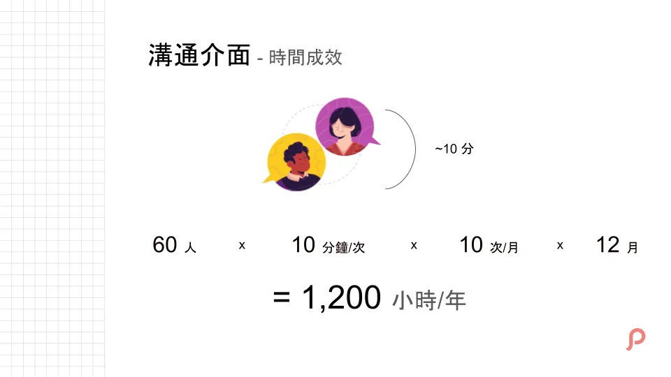 这边假设每次多花的沟通时间是 10 分,团队 60 人,每个月发生 10 次,一年就浪费了 1,200 小时在无谓的沟通上。