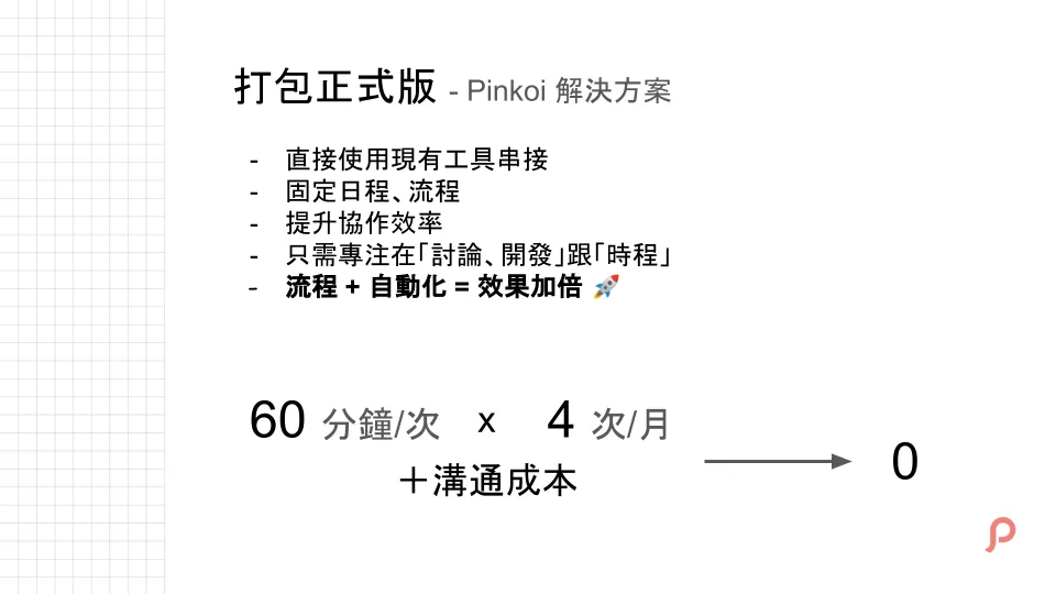 原本除了手动打包时间,其实还有额外沟通上版时间的成本,现在直接归 0;只要确保在时程内 上车 就可以把时间都专注在「讨论」跟「开发」上。