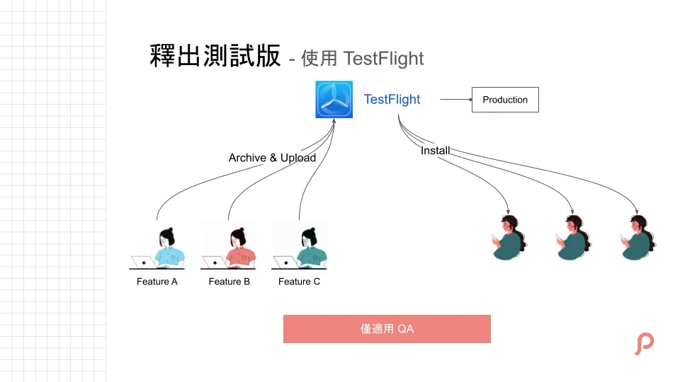 另一个方法是使用 TestFlight 作为测试版发布媒介,我觉得也不错;但有两个问题,第一个是 Testflight 等同 Production 环境,不是 Debug;第二是当同时开发的需求、同事要测不同需求的队友很多,Testflight 就会大乱,包版的 Build 也会狂改,但也不是不行。