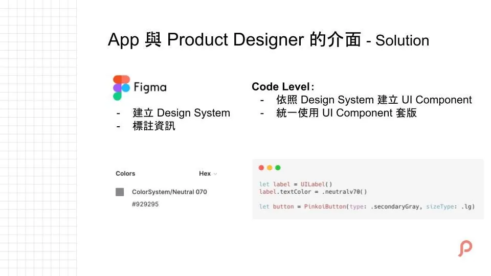 Solution 最基本的就是要先请设计大大整理好 UI 的元件库、建立好 Design System (Guideline),并在出 UI 时做好标记。