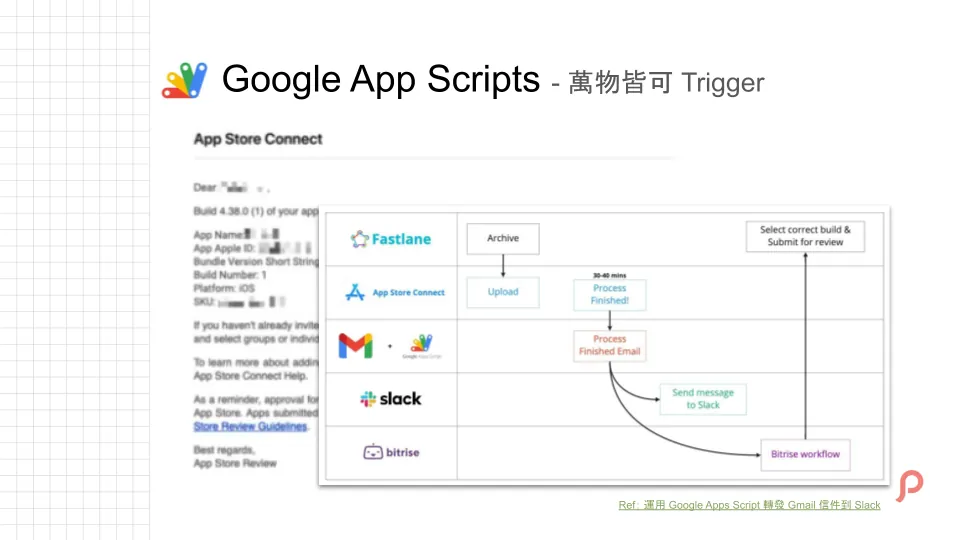 这边多提了 Google App Scripts 的应用,详情可参考: 运用 Google Apps Script 转发 Gmail 信件到 Slack 。