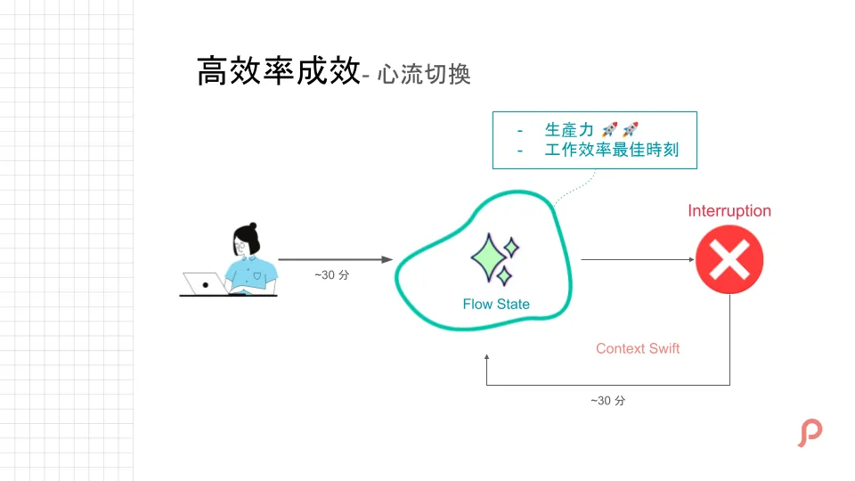 除了刚做的项目,我们还需要多评估 心流切换成本 ,当我们持续投入工作一段时间后就会进入「心流」状态,此时的思绪、生产力都达到巅峰,能提供做好最有效的产出;但如果被无谓的事(EX: 多余的沟通、重复性工作)打断,要重新回到心流,又会再需要一段时间,这边以 30 分钟为例。