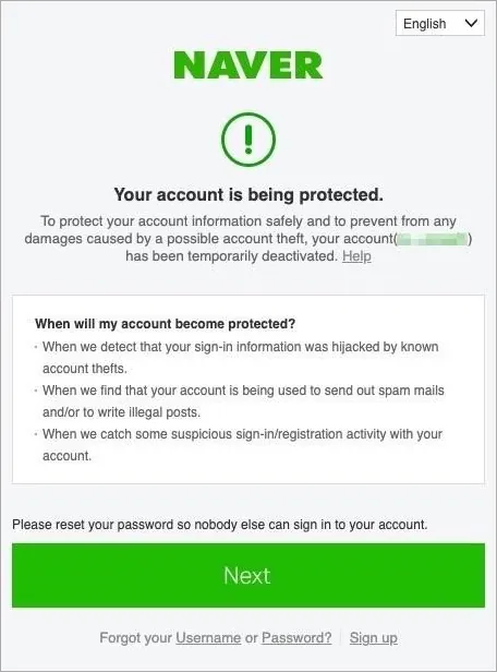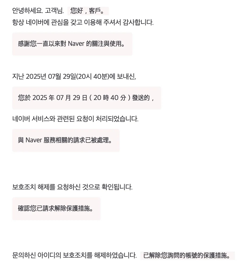原因疑似是在台灣登入被認為是可疑活動觸發 Naver 帳號保護機制。