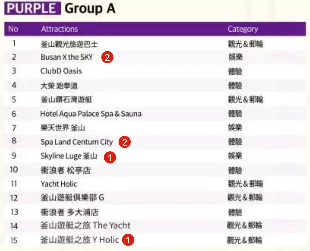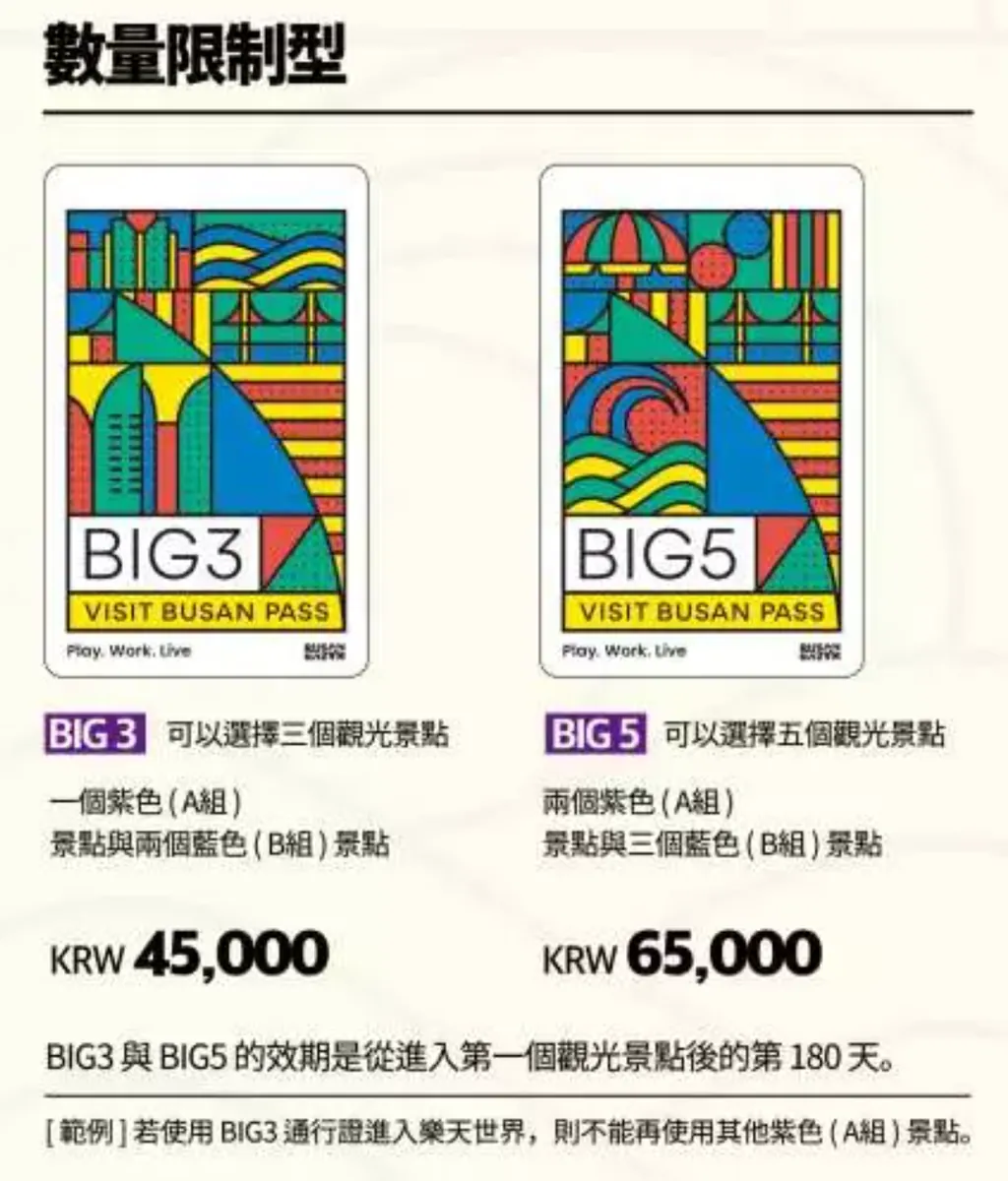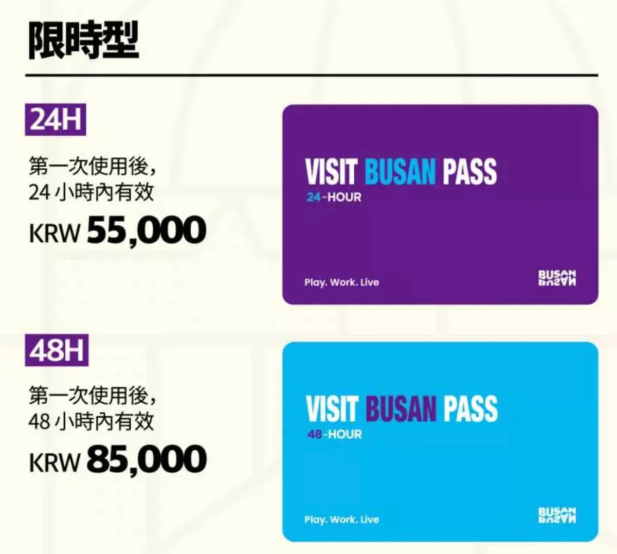 Busan Pass 有分限時(24/48 HR)無限量型跟限制次數型(180天內用完)。