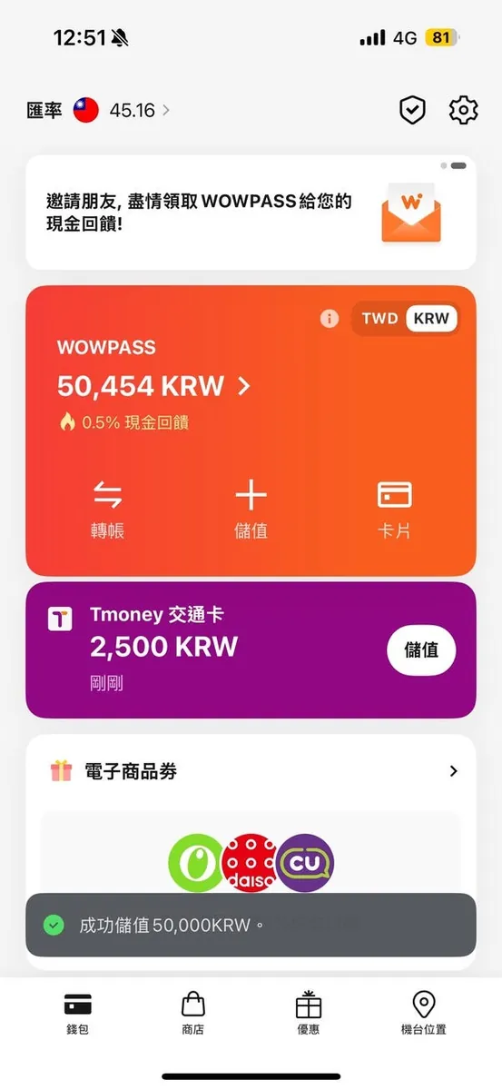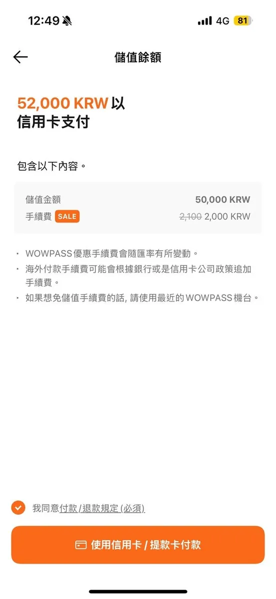 另外今年開始也能直接透過 Wowpass App 加值交通卡,流程是先用信用卡儲值 Wowpass 再從 Wowpass 入金到 Tmoney,流程較多而且需要支付手續費。