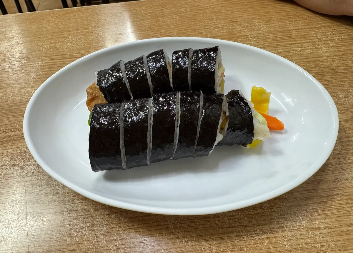 點了海苔捲分著吃跟我點了刀削冷麵,麵的口感很勁道,冰涼爽口;缺點是沒什麼配料(肉),純碳水吃起來很單調。