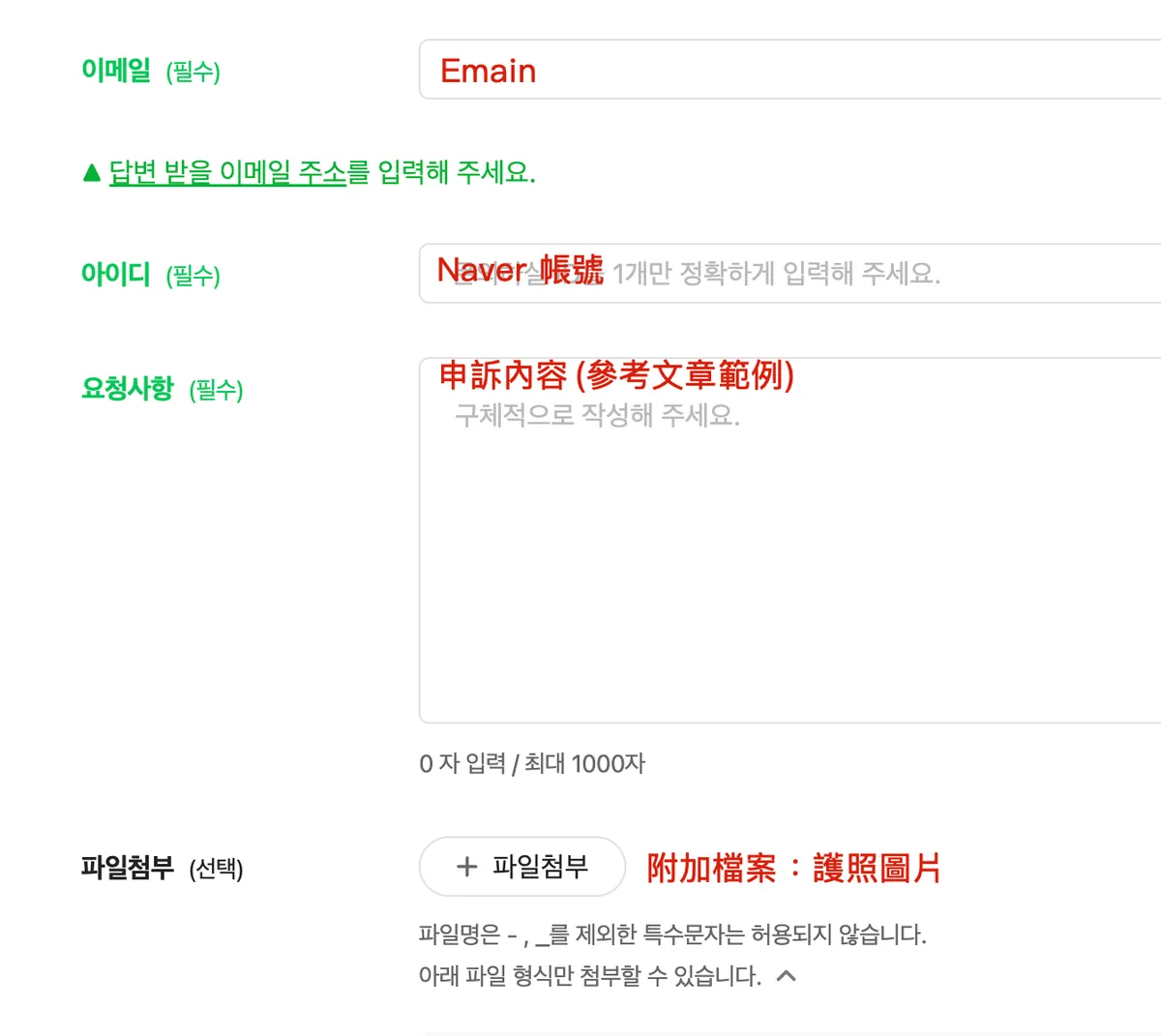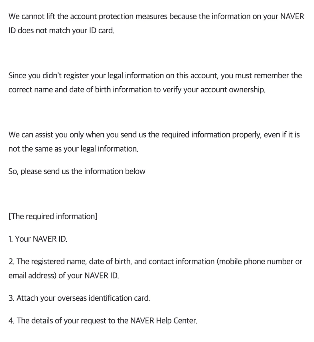 爬 網路資料 說可以填寫表單申請取消保護機制「 Members residing outside of Korea_Request to lift account protection measures 」,但是我不太確定名字的問題,因此第一次申請被拒:
