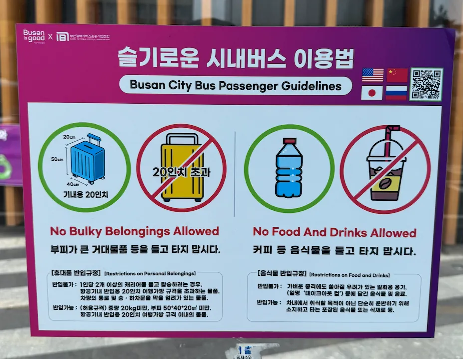 - 釜山公車規定,大於 20 吋行李箱、手持手搖杯禁止搭乘(拿著不喝也不行,真的會攔)