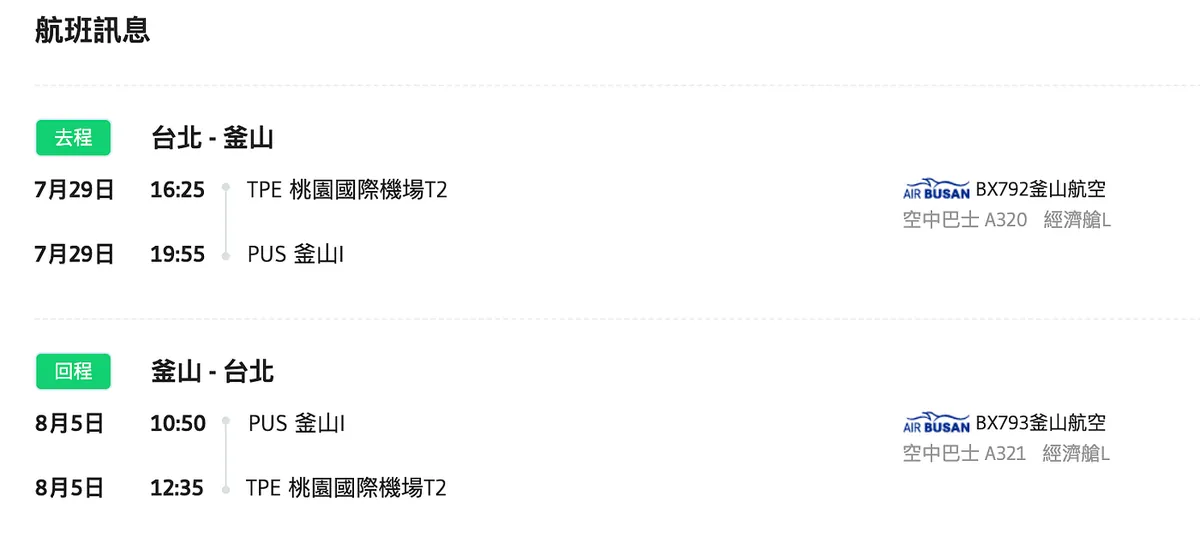 - 出發:07/29(二) 台北桃園(TPE) 16:25 -> 釜山金海(PUS) 19:55