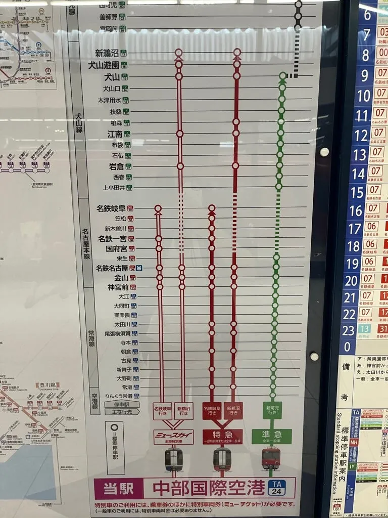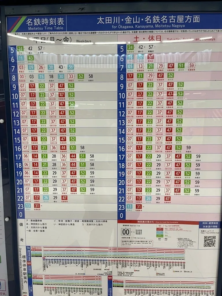 不過如果要省錢跟方便,其實現場買準急或是直接進站搭普通車就可以了;附上列車時刻表及停留站,或直接從 名鐵網站查詢 :