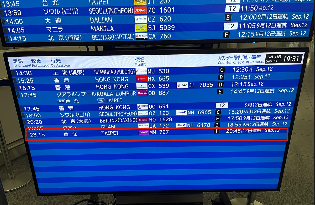 9/12 AM 00:09 — 中部國際機場第一航廈 起飛