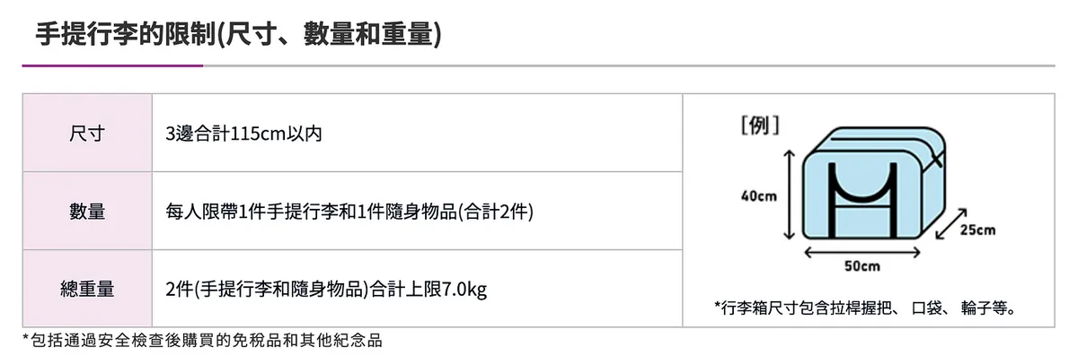 手提行李規定: 每人兩件 & 總重小於 7 公斤
